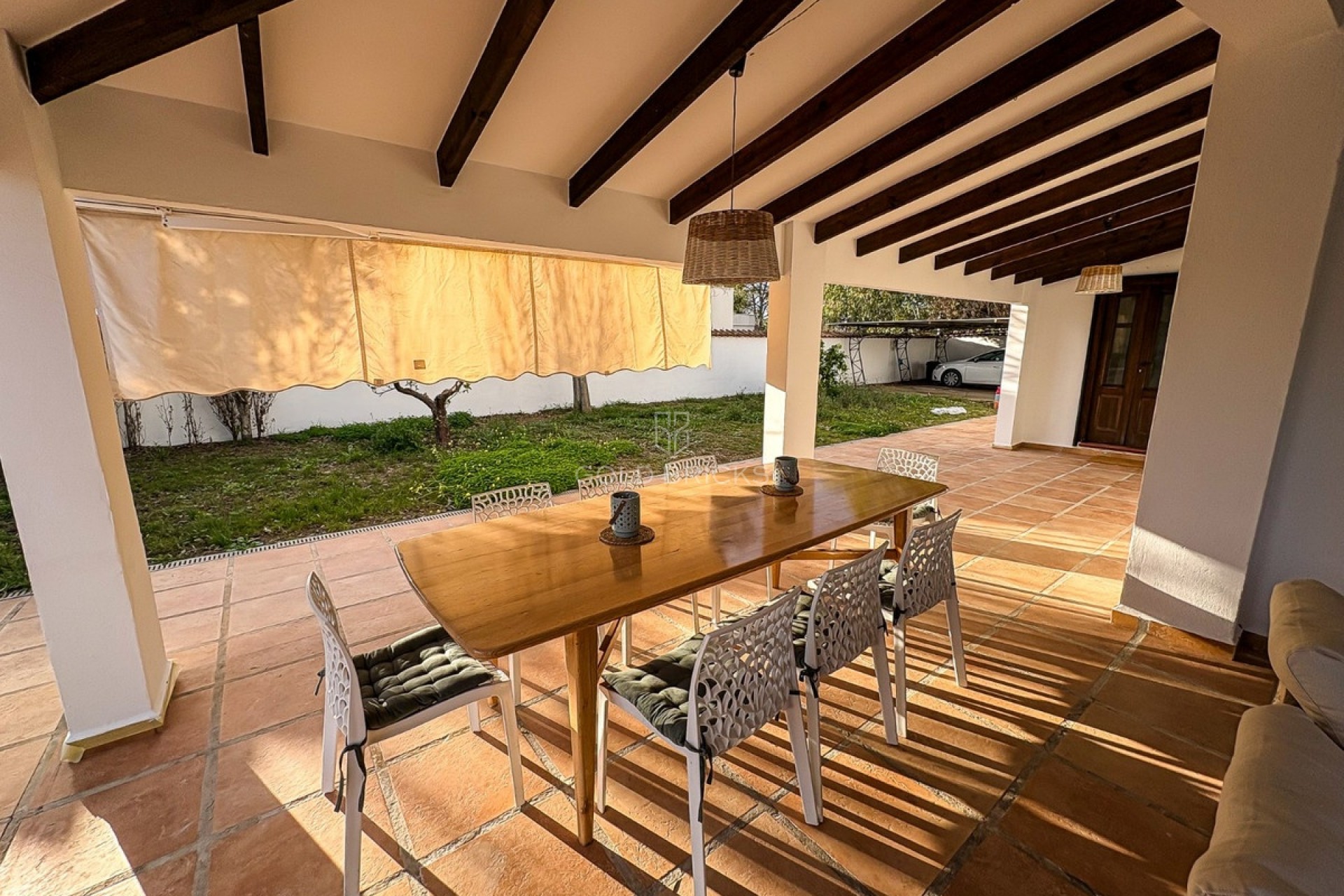 Architectonisch gezien weerspiegelt de villa de essentie van de Middellandse Zee: een witte gevel , vloeiende lijnen , zichtbare balken en een zorgvuldig geselecteerde collectie designmeubelen die het karakter ervan benadrukt. Het is een ideale woning voor liefhebbers van houten architectuur, handgemaakte details en ingetogen luxe .