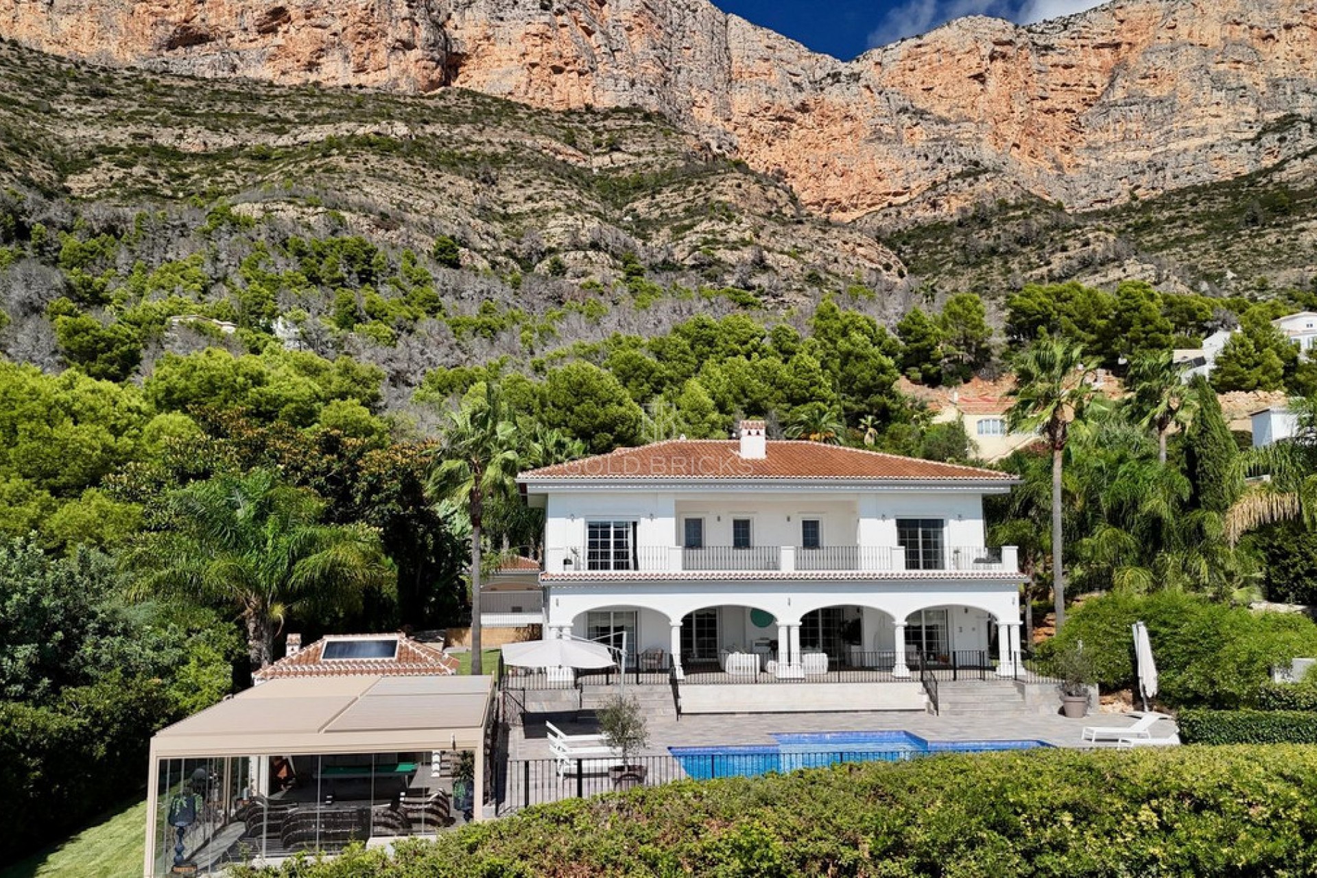 FOR SALE: EXCLUSIVE VILLA ON MONTGÓ, JÁVEA Enjoy stunning mountain and valley views from every corner of this fully furnished and equipped villa — ready to move in. • Total plot size: 3,150 m² • Main house: 439m² | Guest house: 144 m² DESCRIPTION The villa is located on a corner property, with no direct neighbors, in a very private area. The property consists of a two-storey main house with basement, guest house, heated saltwater swimming pool, summer kitchen with barbecue, enclosed pool area, basement with gym and karaoke room, dog house with workshop and garage. It has ample access for vehicles and a parking area. DISTRIBUTION AND DESIGN Main House The villa is distributed over two floors plus a basement, offering spacious and elegant living. It features three bedrooms, five bathrooms, a large dressing room, a private office, and a beauty room, making it ideal for both comfort and lifestyle. On the ground floor, a spectacular entrance hall with double-height ceilings and stained-glass windows welcomes you with natural light. The main living room includes a working fireplace with hand-painted golden details, while a second lounge area is designed for entertainment, equipped with a large TV and automatic blinds. The modern kitchen is fully equipped with high-quality appliances by Gaggenau, including an American-style fridge and a large wine fridge, and connects directly to the terraces, pool, and summer house. A guest toilet and office complete this level. The private study is set apart from the main living areas, offering an ideal environment for focused and quiet work. If needed, the space can easily be converted into an additional bedroom. Basement The lower level of the villa is dedicated to leisure and wellness. It features a fully equipped gym for everyday training, as well as a karaoke studio with professional sound system, microphones, and a large screen—a perfect space for entertainment with family and friends. Extras & Technology The villa is equipped with the latest comforts and technology to ensure a luxurious living experience. It offers air conditioning (heating and cooling) and underfloor heating throughout, as well as double-glazed windows with electric blinds for both efficiency and comfort. For entertainment, the house includes an 85-inch television, while video surveillance and a full smart-home system provide security and convenience. Connectivity is guaranteed thanks to fiber-optic internet with dual providers, always ensuring uninterrupted service. Pool & Chill-Out Areas At the heart of the estate lies the saltwater swimming pool with a heating system, perfect for year-round enjoyment. Surrounding the pool, a spacious terrace offers cozy chill-out areas, designed for relaxation and quality time with family and friends. Terraces & Leisure Areas The villa offers multiple outdoor spaces designed for both relaxation and entertainment. A fully equipped summer kitchen with automatic roof and BBQ makes it ideal for dining al fresco. The beautifully landscaped garden features over 60 palm trees and lush Mediterranean plants, all maintained with a domotics-controlled automatic irrigation system. Entrance & Additional Spaces The villa is accessed via double automatic gates a grand main entrance. The entire perimeter is secured with reinforced fencing, ensuring privacy and safety, while also adapted for pets. A guest house with open-plan kitchen and bathroom offers independence and comfort, with beautiful views of Montgó and the main residence. The garage with storage room is equipped with an electric car charger, providing modern convenience. For pet lovers, the property includes a dedicated dog kennel with cleaning area, covered open-air space, and a 36 m² workspace. The property has ample parking for 3–5 cars, completing the estate's functionality. Location The villa is located within 5 minutes' reach of La Sella golf course, several restaurants, as well as La Ermita Local Market supermarket. Jávea – a Mediterranean sanctuary between the sea and the mountains. This prestigious Costa Blanca destination blends the charm of a traditional coastal town with the comfort of an exclusive modern resort. Turquoise coves, over 300 days of sunshine a year, and the natural beauty of the Montgó Natural Park create an ideal setting for both relaxation and refined living. The town is divided into three key areas — the historic Old Town, the lively marina, and the vibrant Arenal beachfront. Here you'll find top-class dining, international school Xábia International College and a welcoming international community. Jávea offers a premium lifestyle in one of the most desirable Mediterranean locations.