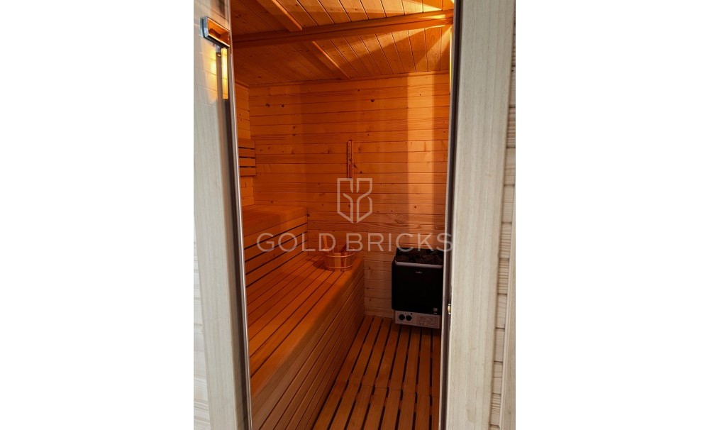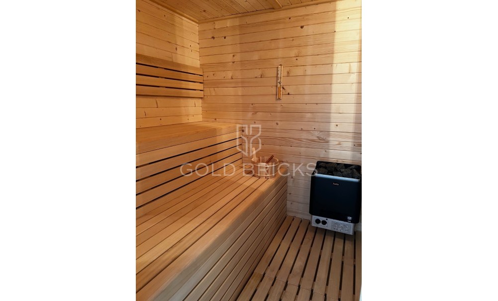 I det gemensamma området finns en stor pool, lekplats, gym, bastu och badtunna för ägarna.